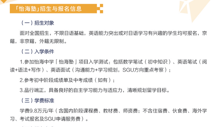 怡海中学依托二十余年办学积淀,推出日本留学专项项目「怡海塾」,以“国内2.5年+日本1年”的“2.5+1”模式,打造“EJU考试+SGU英文申请”双通道,直通日本本科院校的高效路径。项目核心优势聚焦“国内培养实力”,具体如下:
