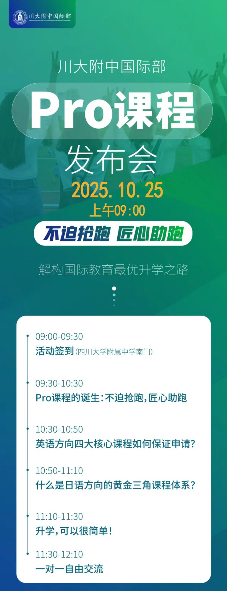 10月25日,川大附中国际部Pro课程发布会,我们想和您聊聊:如何让每个想稳步成长的孩子,在适合自己的课程里找回学习信心。也让孩子能在一步一个脚印的笃定里,看到只属于自己的坦途。