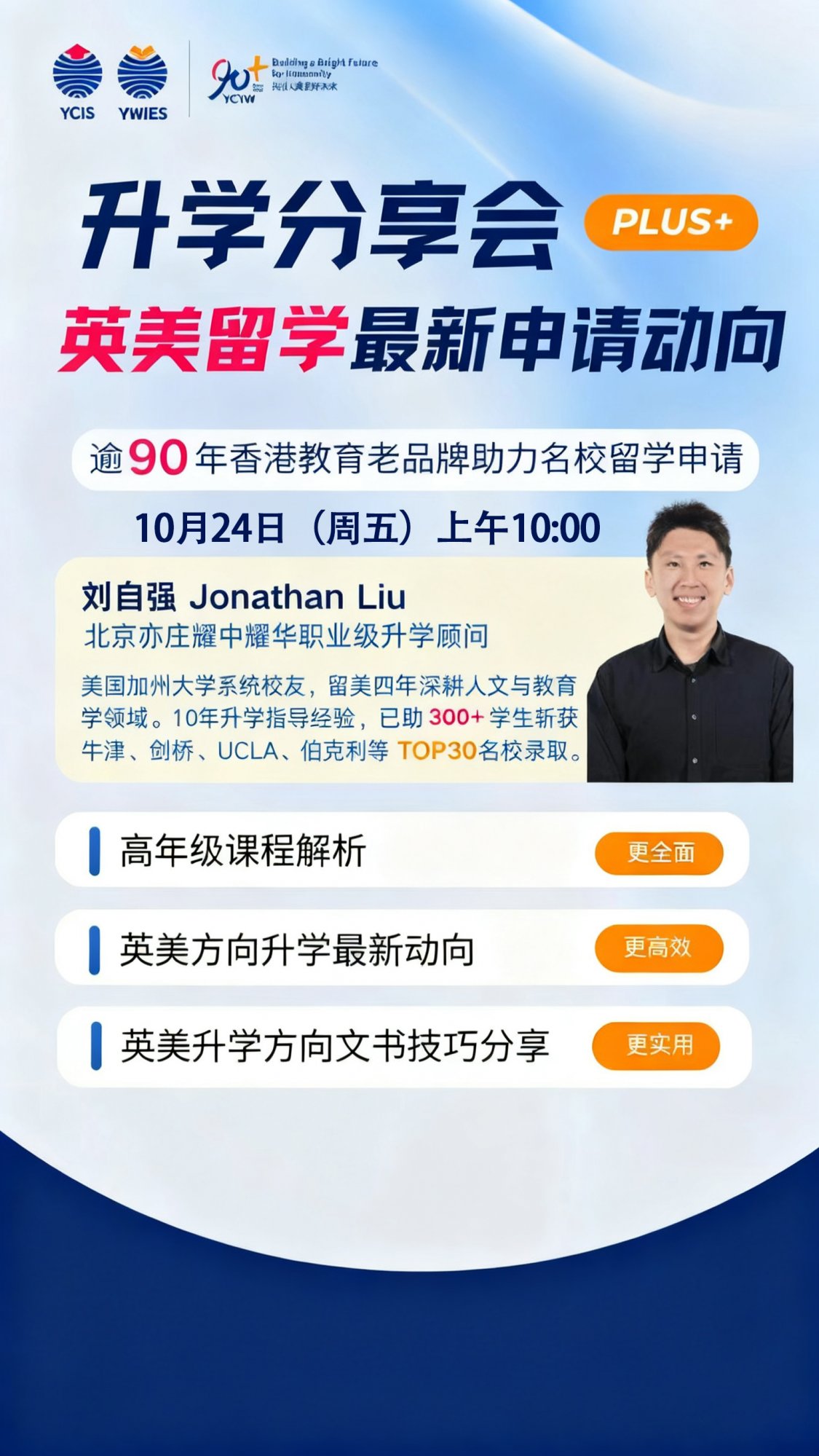本周五,24号上午10点,北京耀华校区每月升学讲座之---英美留学趋势及方案,将由耀华升学主管老师盛情开讲。