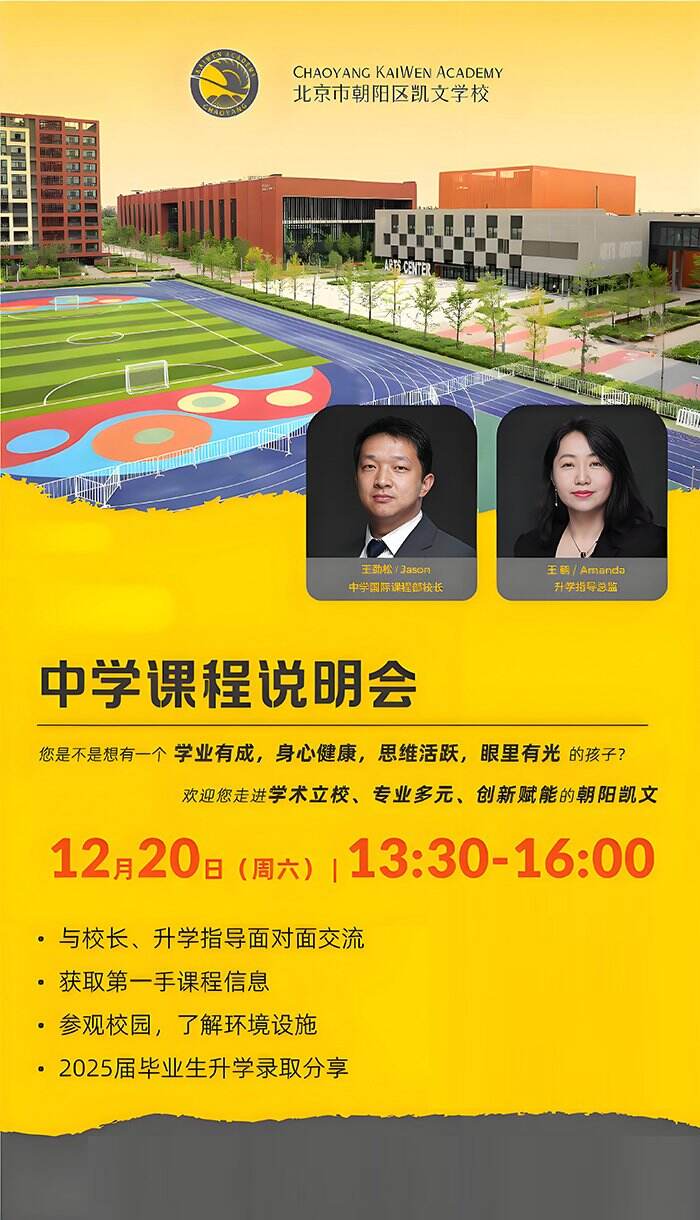 想让孩子学业拔尖、身心舒展,还能在科创、体育、艺术里闪闪发光?12月20日,北京市朝阳凯文学校「小学+中学课程说明会」双场联动,邀你沉浸式解锁“学业+素养”双优的成长路径!