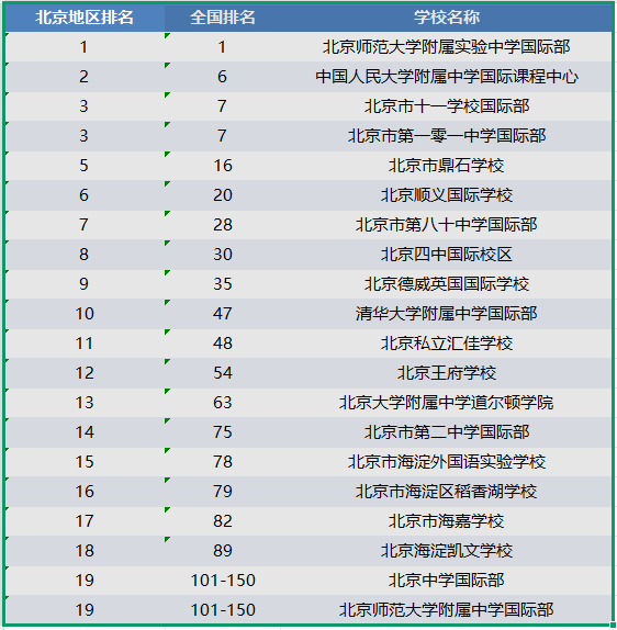 榜单末尾的北京中学国际部与北京师范大学附属中学国际部虽并列北京第19名,全国排名处于101-150名区间,但这两所学校均为公立中学国际部,依托公办学校的优质资源,仍具备较强的发展潜力。