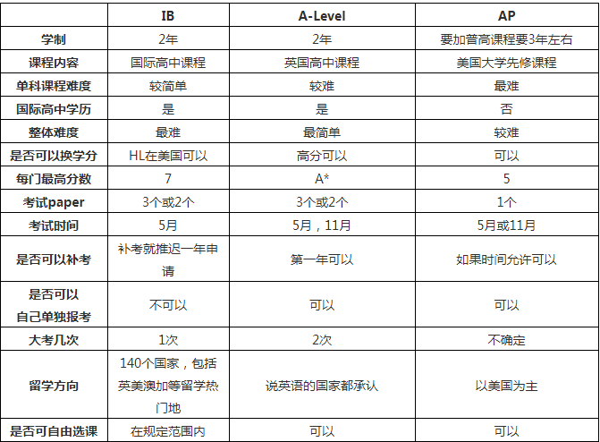 在IB、A-Level、AP课程里面,就单科整体的知识难度上来说,AP是最难的(一些科目除外)。其中生物、微积分、化学、经济、心理学、历史等是大学一年级的课程,但一些语言类,如法语、西班牙语、德语等要完成相当于大学三年六个学期的课程,难度可想而知。