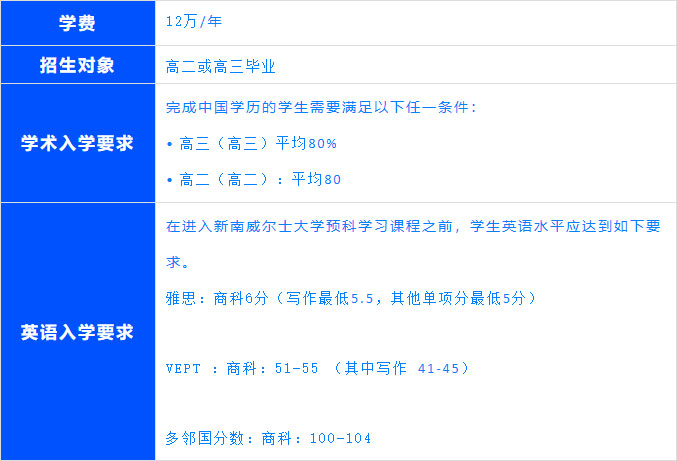 新南威尔士大学于1989年开办了大学预备课程(University of New South Wales Foundation Year,简称UNSW预科),为澳大利亚历史最久的预备课程,在全澳排名第一,被澳大利亚所有大学(包括著名的“八校联盟”)、新西兰、英国等多所学校认可。