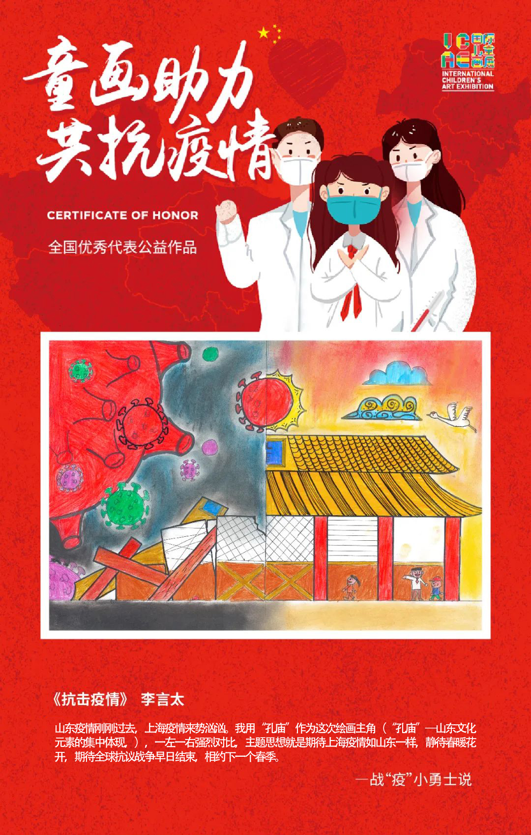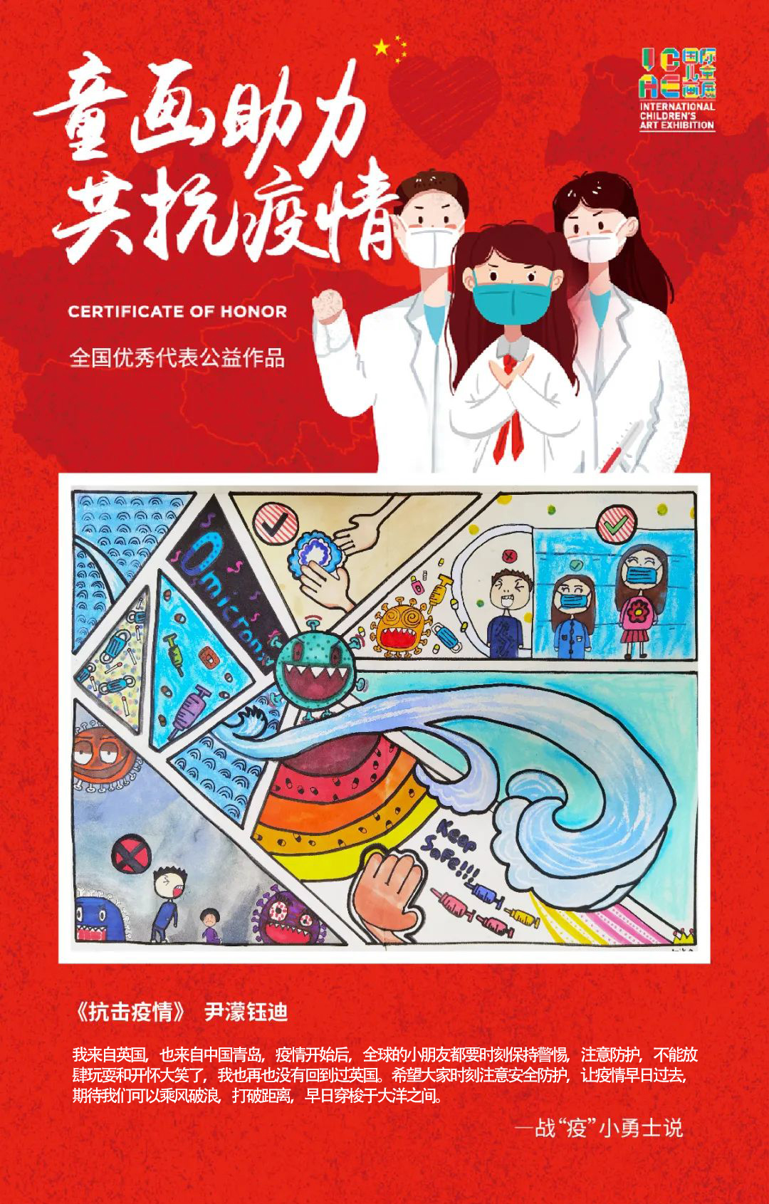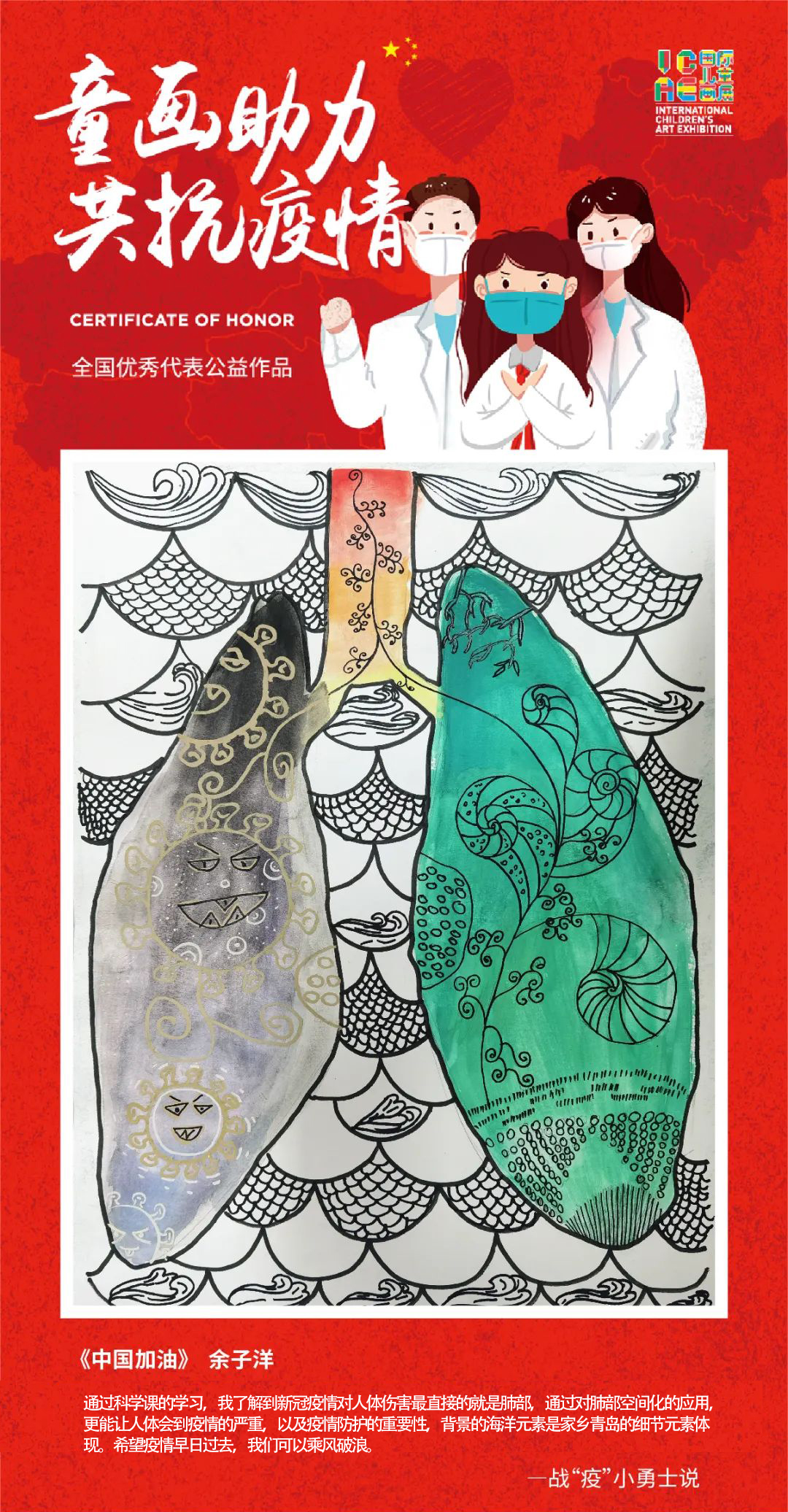 为感谢孩子们满满的爱,ICAE国际儿童画展组委会携ICAE评审团优选优秀作品,并为获奖小朋友颁发“童画助力·共抗疫情”荣誉证书。