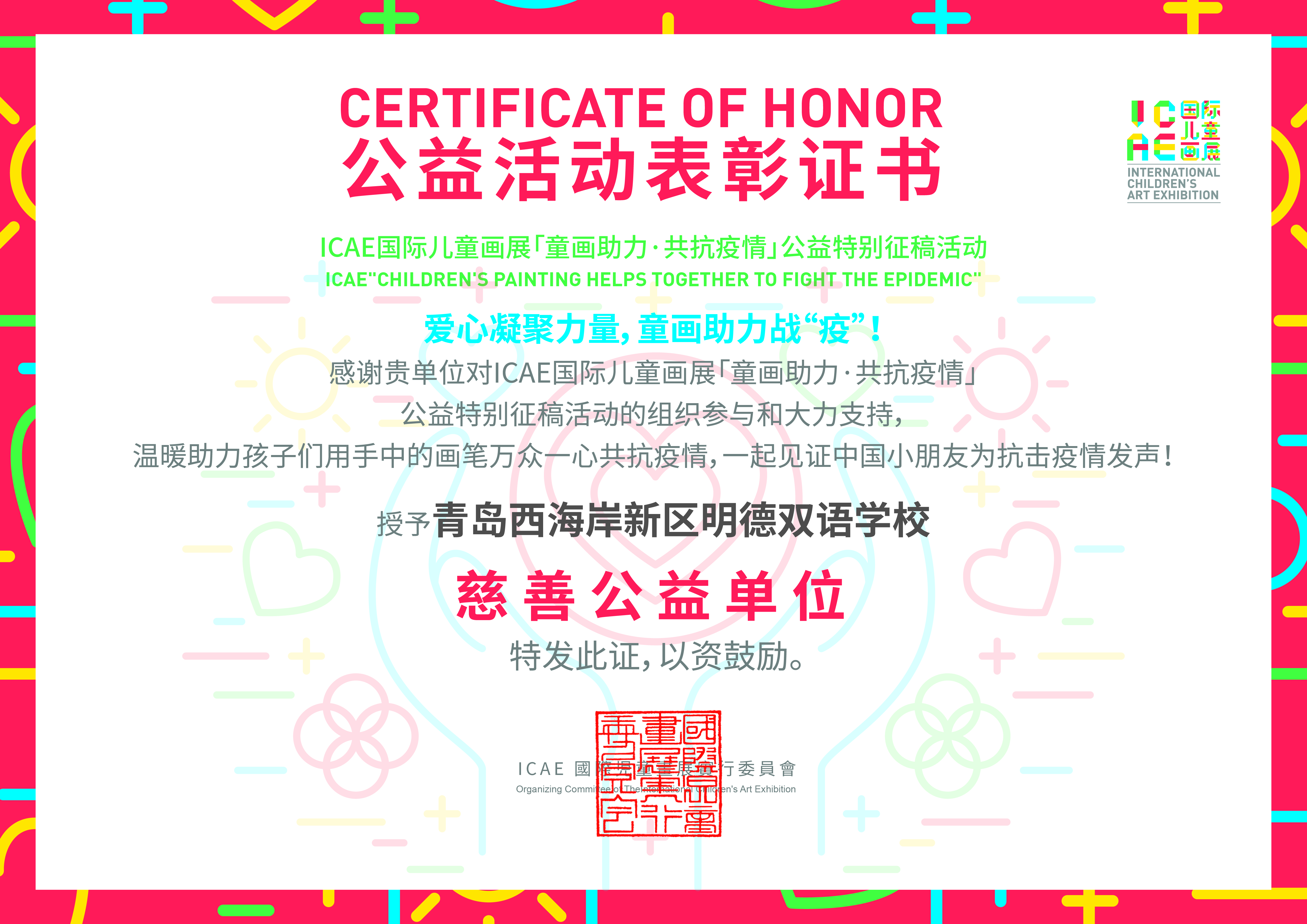 艺术教育是明德双语全人教育的重要一环,我们希望学生能在不同领域的艺术探究中不断发挥想象,实现艺术创作灵感和实践技巧的全面卓越。孩子们积极参加此次『童话助力·共抗疫情』公益特别活动,离不开艺术老师的指导,同时也为学校争得了荣誉,青岛明德双语学校被授予慈善公益单位。