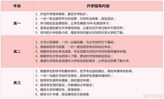 从高一入学开始,长郡国际部为每一位学生都配备经验丰富的升学指导顾问,启动对学生整个三年的升学规划和一对一指导,为学生提供活动规划、标准化学术考试、选校、文书、大学申请、签证办理等一站式升学指导服务。