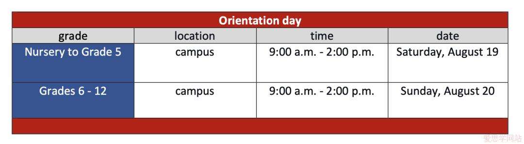 During the on-campus orientation, parents/guardians will have the opportunity to collect their child's information package. Additionally, representatives from Admissions, Finance, ASA (After-School Activities), School Bus services, Sodexo (Cafeteria), and senior academic administrators will be present to address any inquiries and provide assistance as needed.