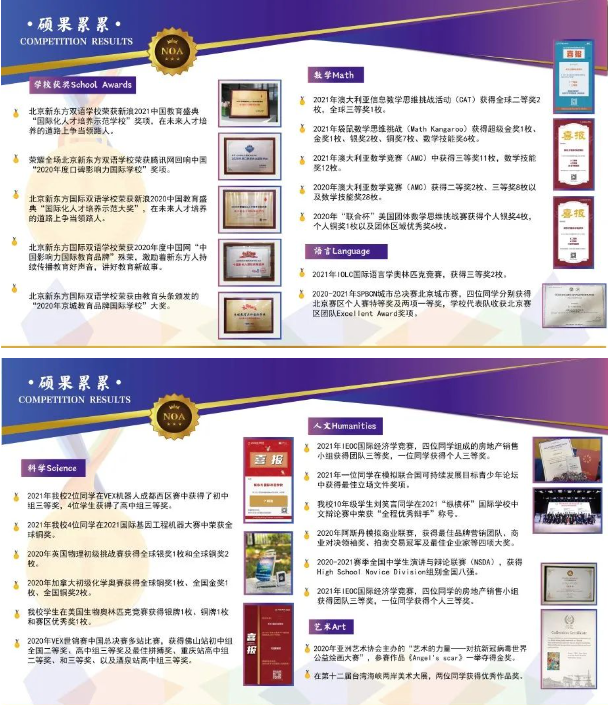 同时鼓励学生积极参与到国内、国际多项赛事当中,在更大的舞台上展现新东方学子的风采。学校也会根据学生不同程度,鼓励学生们参与不同层级的国内外竞赛。既有普适性的竞赛,倡导越多的孩子参与,让自己得到一定锻炼。还会有进阶性的竞赛,鼓励学有余力的优秀学生,进行挑战,取得更加优异、更有竞争力的优异成绩,让每一位新东方学子的光芒不仅仅点亮校园,同样在世界舞台尽情绽放。