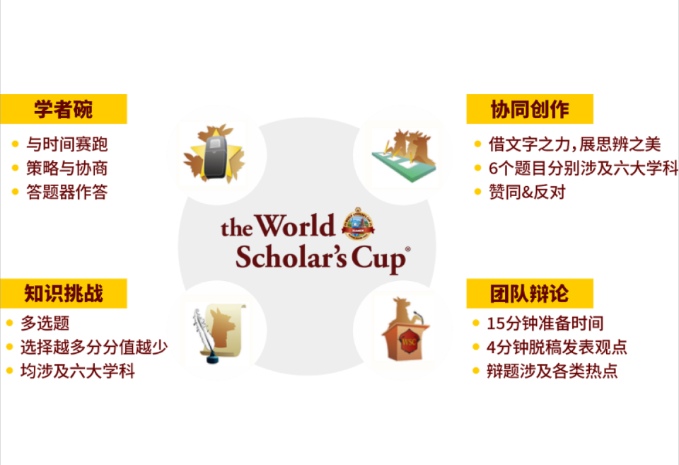 冠军轮是世界学者杯每年当中最重要的盛典。小学者们可以和实力强劲的团队进行竞技和相互学习,更有机会直面耶鲁大学师生团队,与他们进行学术交流与探讨!世界学者杯介绍图片源自官方公众号