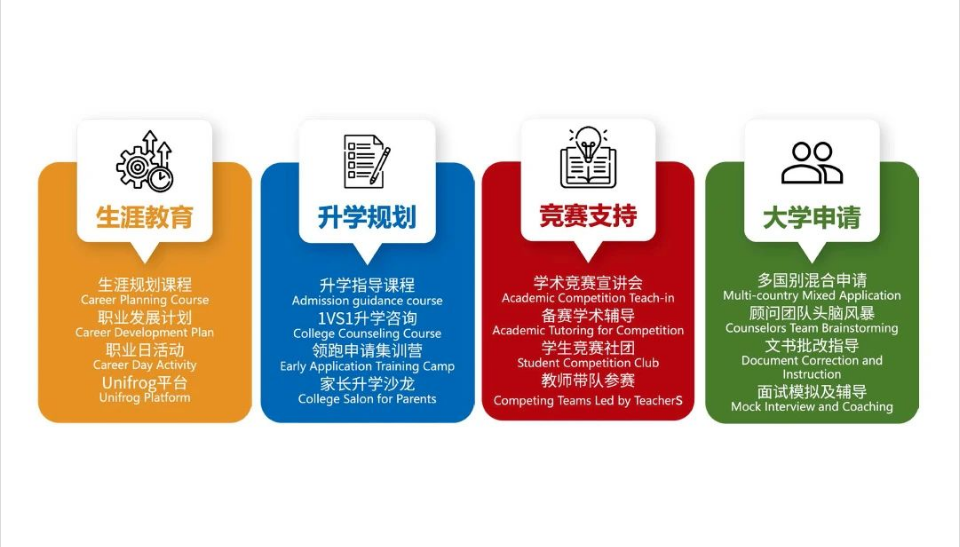 海嘉对学生升入名校的支持系统有两个,一个是“嘉+”计划,是海嘉学校打造的一个杰出的学术支持项目。旨在为优秀的学生提供全面的支持及策略,包括奖学金支持,标准化考试支持,海嘉校友资源支持,学术计划及课外计划管理等,此过程将贯穿其在海嘉整个学术生涯,直到被世界一流大学或学院录取。