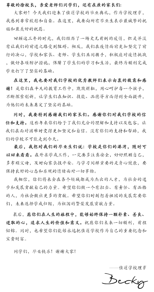 现在,你们即将步入人生的新阶段,拥抱更广阔的未来。无论你们是进入大学,走上职业生涯,还是追求自己的梦想,我希望你们能永远珍惜在嘉联度过的美好时光,记住我们共同的努力和成就。无论你们将来走到哪里,都要牢记教育赋予你们的力量和影响,牢记自己的使命和责任。面对未来的挑战,保持对知识的渴望和对卓越的追求,保持对生活的热情和积极的态度,保持自信,勇往直前。