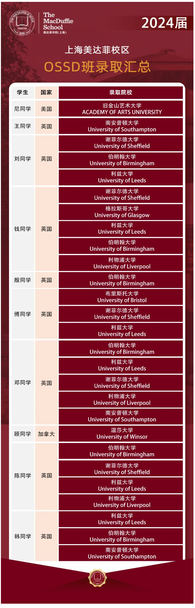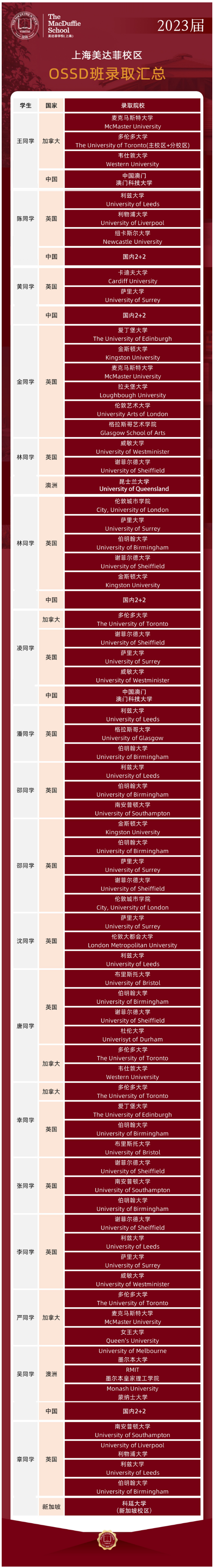 有了这些优势加持,上海美达菲OSSD课程的所有学子们都取得了世界Top100名校Offer,还有学子拿到了奖学金(最高$8000英镑),去往英国、加拿大、澳洲、日本等地就读。