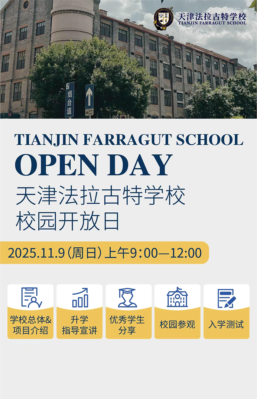 2025年11月9日(周日)上午9:00-12:00,天津法拉古特学校校园开放日启幕。您可深度参与学校总体&项目介绍、升学指导宣讲、优秀学生分享、校园参观、入学测试等环节,沉浸式感受“学术扎实、视野全球、成长多元”的教育生态。